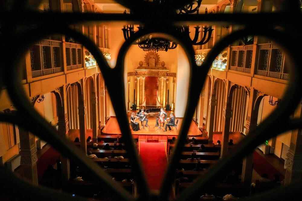 2025年1月30日,游客和市民在哈尔滨老会堂音乐厅欣赏弦乐四重奏《爱的致意》。