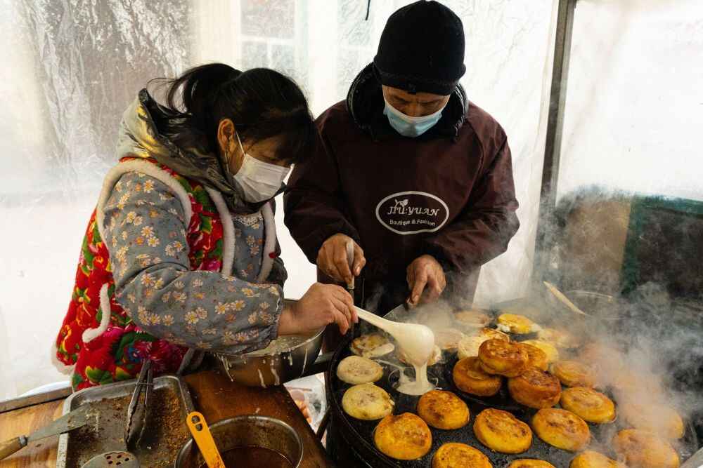 2024年1月22日,在哈尔滨红专街早市,一名摊主售卖粘豆包。