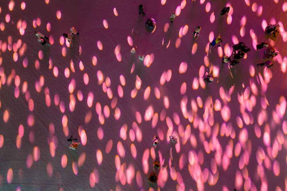 2025年1月15日,游客在哈尔滨冰雪大世界园区内欣赏光影秀。