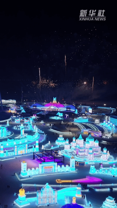 哈尔滨冰雪大世界上演浪漫烟花秀