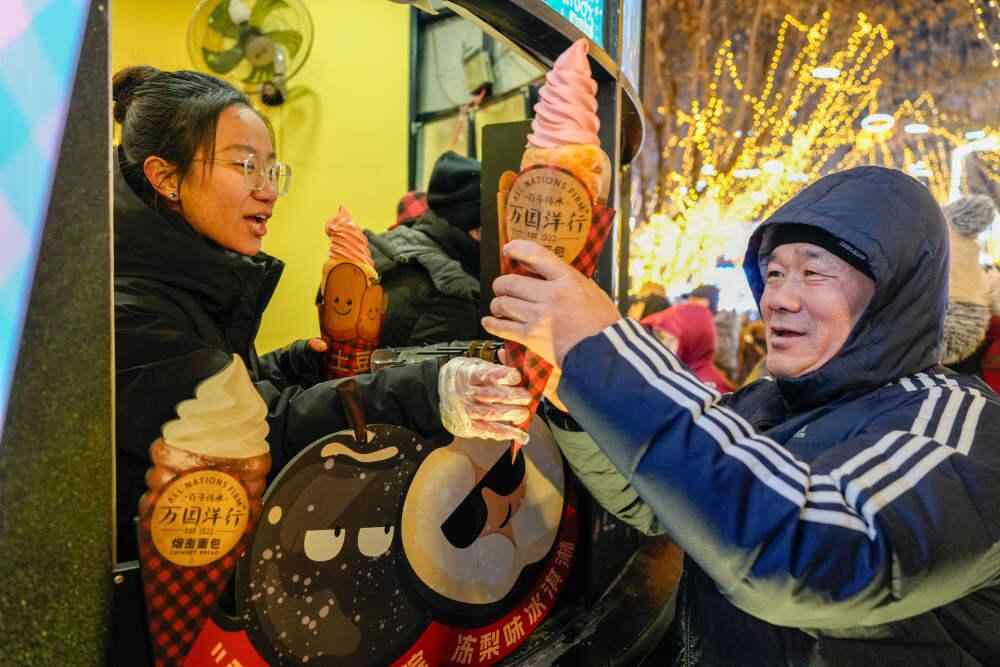 2025年1月30日,游客在哈尔滨中央大街上购买“烟囱冰淇淋”。