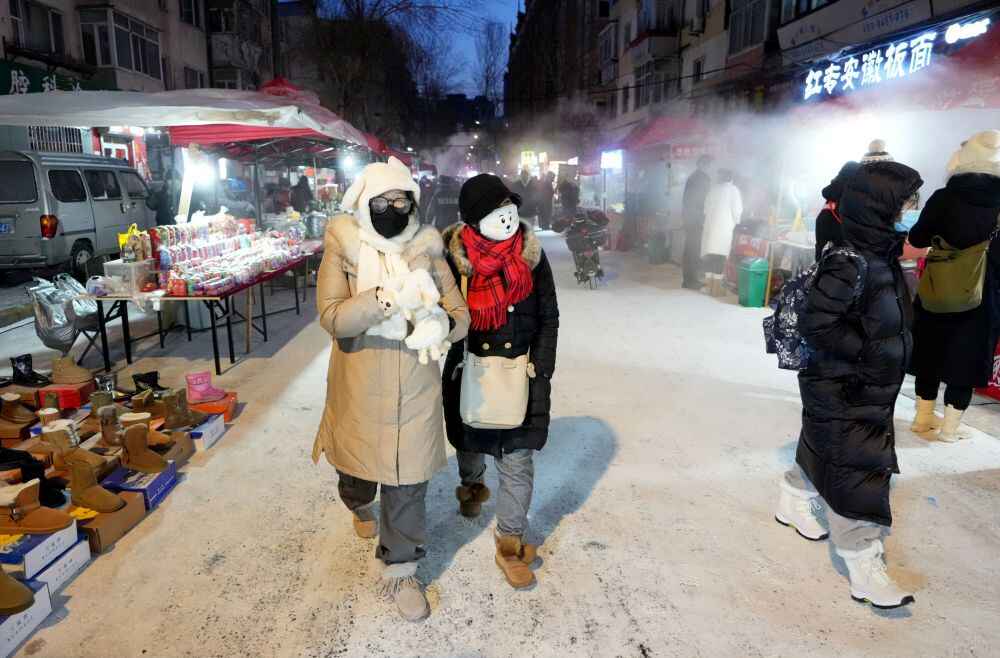 2024年1月22日,在哈尔滨红专街早市,游客穿着厚厚羽绒服逛街。