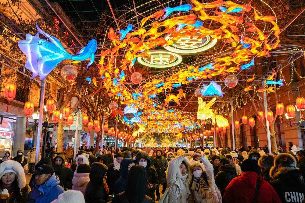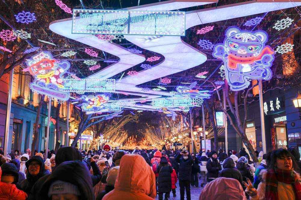 2025年1月30日,游客在哈尔滨中央大街上的亚冬会主题灯饰下游玩、拍照。