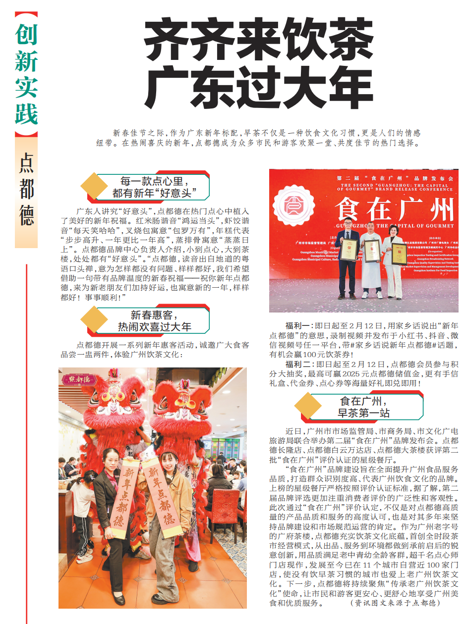 春佳节之际,作为广东新年标配,早茶不仅是一种饮食文化习惯,更是人们的情感纽带。在热闹喜庆的新年,点都德成为众多市民和游客欢聚一堂、共度佳节的热门选择。
