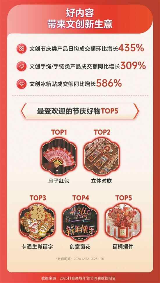 除了吃喝,如何扮靓居室迎新年,也是年轻消费者关注的话题。一批结合传统文化与现代元素的“国货潮品”登上文创年货的C位。数据显示,大促期间,文创节庆类产品日均成交额环比增长435%,其中,手绳和手链类产品成交额同比增长309%,冰箱贴成交额同比增长586%。在大量优质短视频和直播内容推介下,含有“蛇”元素的扇子红包、立体对联、卡通生肖福字、创意窗花、福桶摆件成为最受欢迎的五大节庆好物。