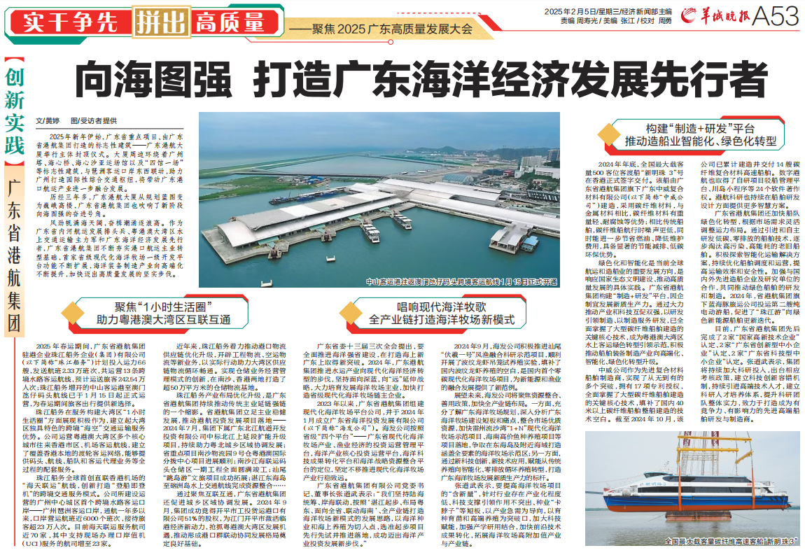 绿色化和智能化是当前全球航运和造船业的重要发展方向,是响应国家生态文明建设、推动高质量发展的具体实践。广东省港航集团构建“制造+研发”平台,因企制宜发展新质生产力。通过大力推动产业和科技互促双强,以研发引领制造、以制造服务研发,已全面掌握了大型碳纤维船舶建造的关键核心技术,成为粤港澳大湾区水上客运绿色转型引领示范,积极推动船舶装备制造产业向高端化、智能化、绿色化转型升级。