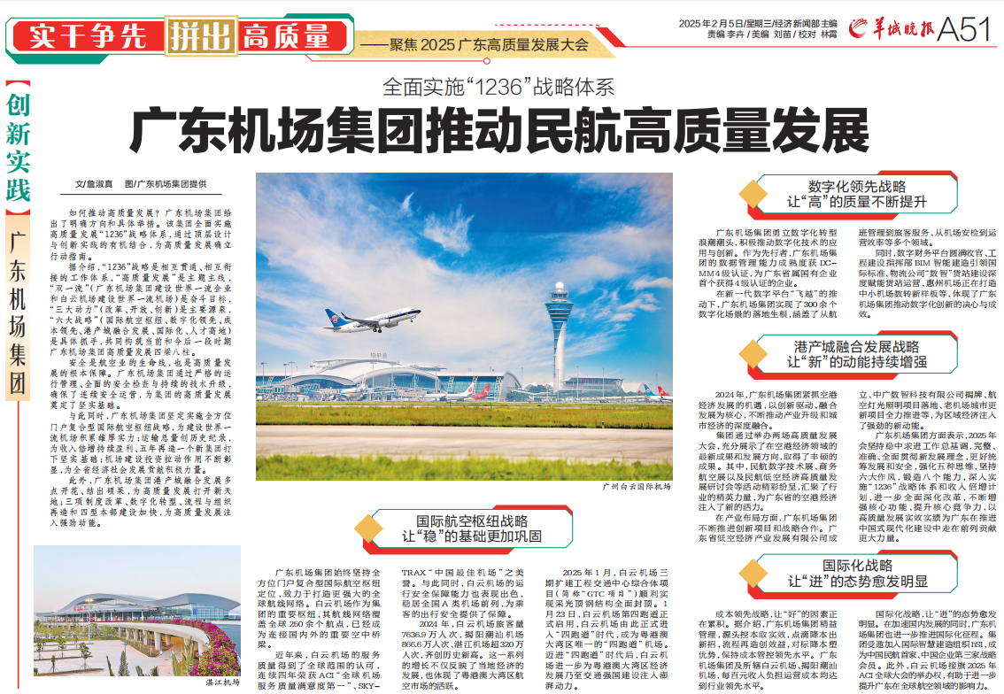 如何推动高质量发展?广东机场集团给出了明确方向和具体举措。该集团全面实施高质量发展“1236”战略体系,通过顶层设计与创新实践的有机结合,为高质量发展确立行动指南。