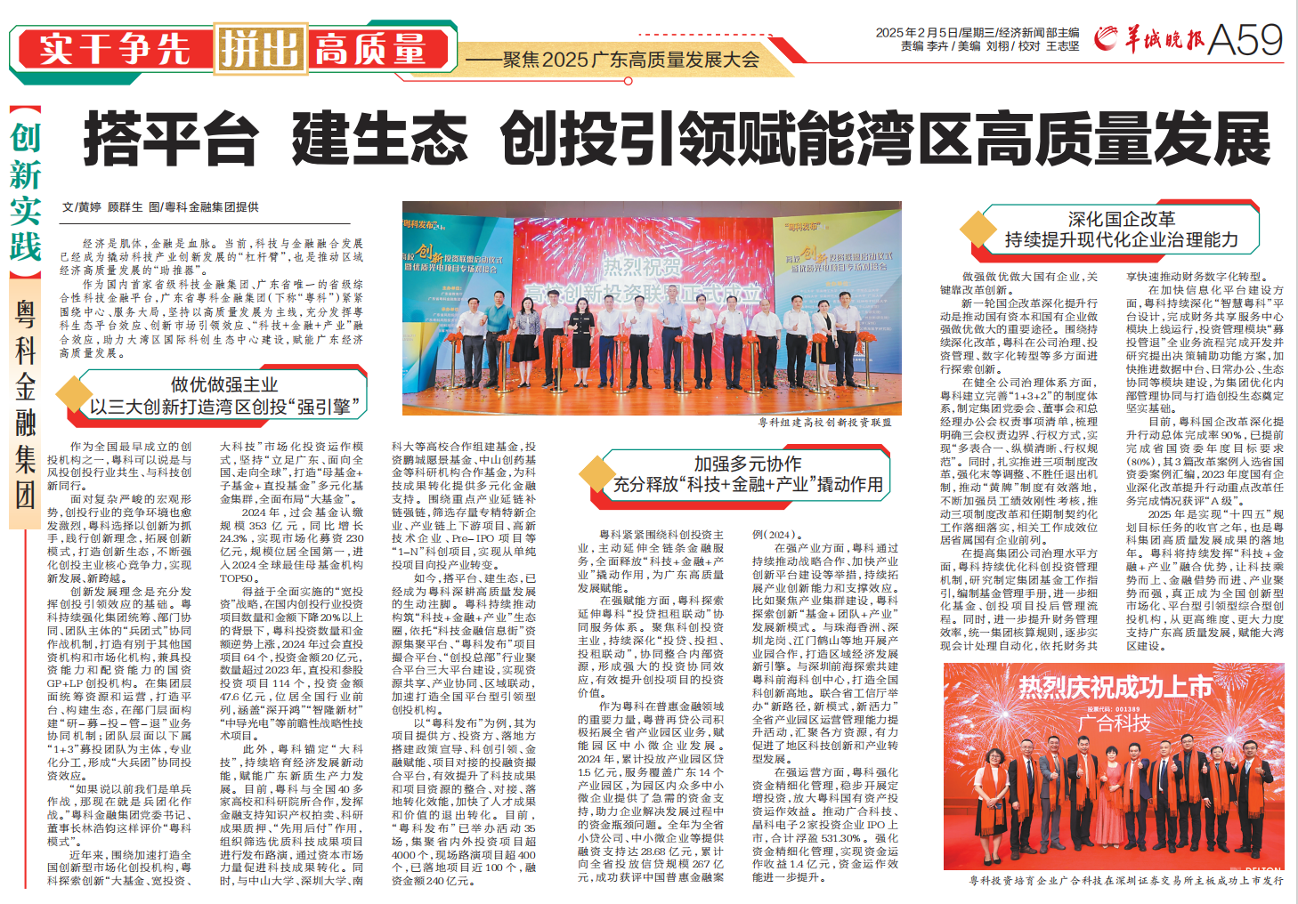 作为国内首家省级科技金融集团、广东省唯一的省级综合性科技金融平台,广东省粤科金融集团(下称“粤科”)紧紧围绕中心、服务大局,坚持以高质量发展为主线,充分发挥粤科生态平台效应、创新市场引领效应、“科技+金融+产业”融合效应,助力大湾区国际科创生态中心建设,赋能广东经济高质量发展。