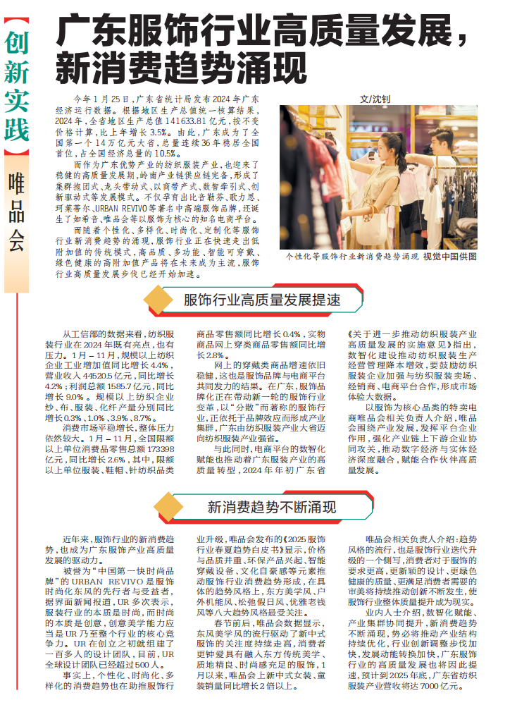 以服饰为核心品类的特卖电商唯品会相关负责人介绍,唯品会围绕产业发展,发挥平台企业作用,强化产业链上下游企业协同攻关,推动数字经济与实体经济深度融合,赋能合作伙伴高质量发展。