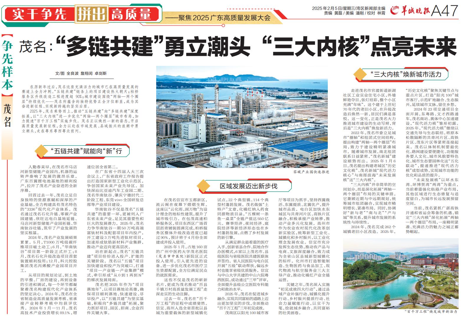 2025年,茂名乘势而上,推动“五链共建”向“多链共建”深度拓展,以“三大内核”进一步优化“两轴—两个圈层”城市布局,加力提速“百千万工程”实施步伐。茂名正以焕然一新的姿态,开启高质量发展新征程,全力以赴在市域发展、县域振兴的浪潮中勇立潮头,走在粤东粤西粤北前列。