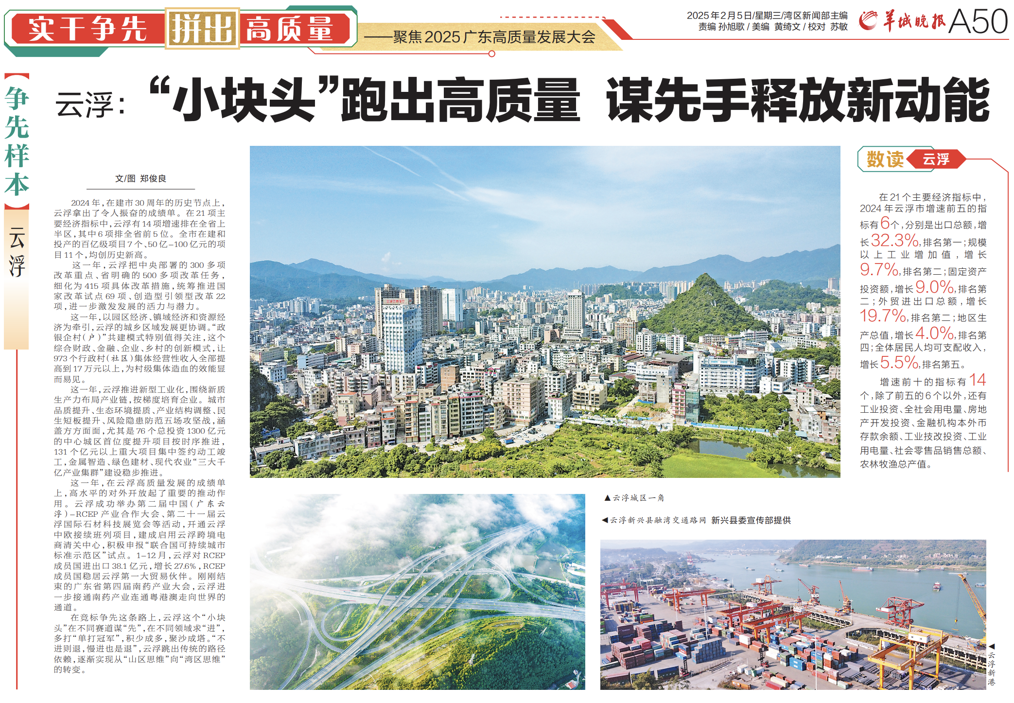 2024年,在建市30周年的历史节点上,云浮拿出了令人振奋的成绩单。在21项主要经济指标中,云浮有14项增速排在全省上半区,其中6项排全省前5位。全市在建和投产的百亿级项目7个、50亿-100亿元的项目11个,均创历史新高。