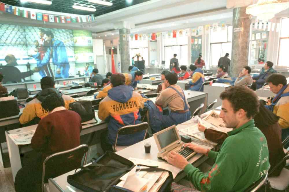 这是第三届亚冬会的新闻中心记者工作间,设有大屏幕和信息库。
