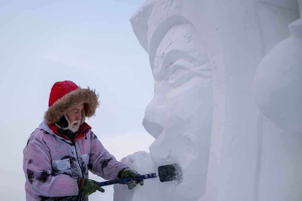 2025年1月7日,参赛选手在太阳岛雪博会园区内进行雪雕创作。