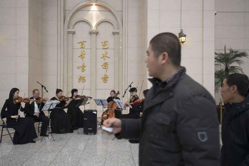 2020年1月10日,哈尔滨火车站候车大厅,旅客拿着车票经过演奏现场。