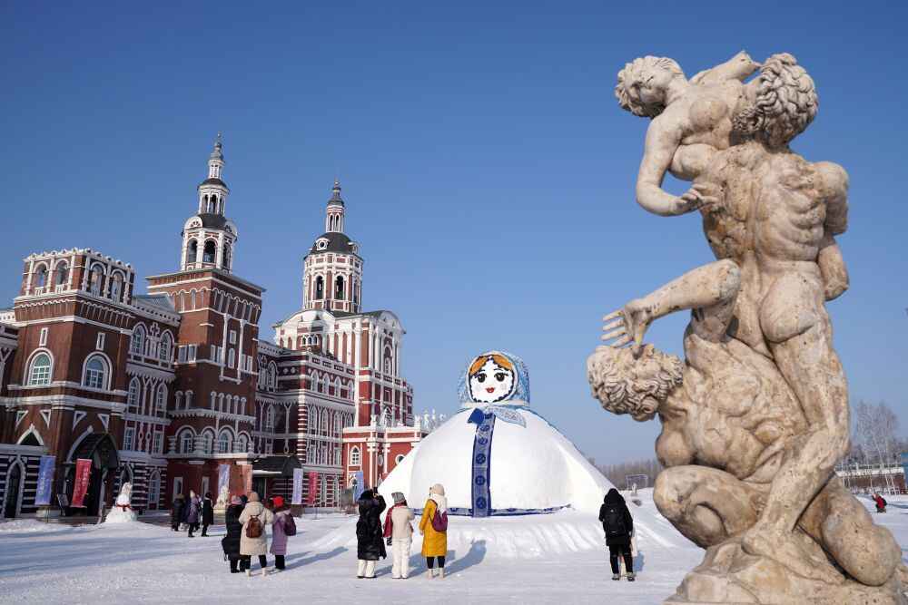 2024年1月11日,游客在哈尔滨建筑艺术广场游玩。