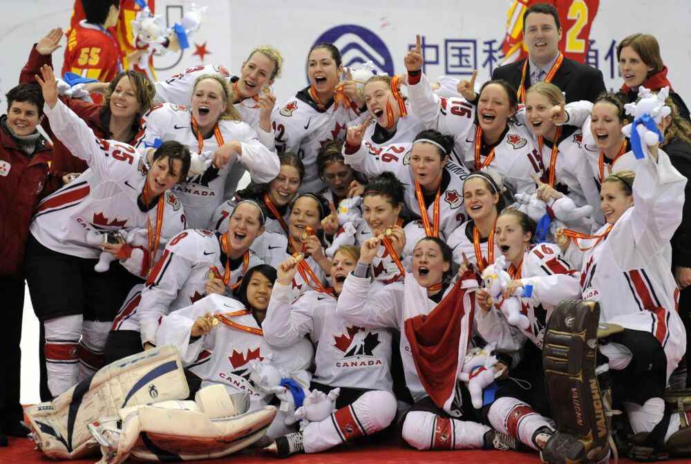 2009年2月27日,加拿大队成员在领奖台上合影。当日,在哈尔滨举行的第24届世界大学生冬季运动会女子冰球决赛中,加拿大队以3比1战胜中国队,获得冠军。