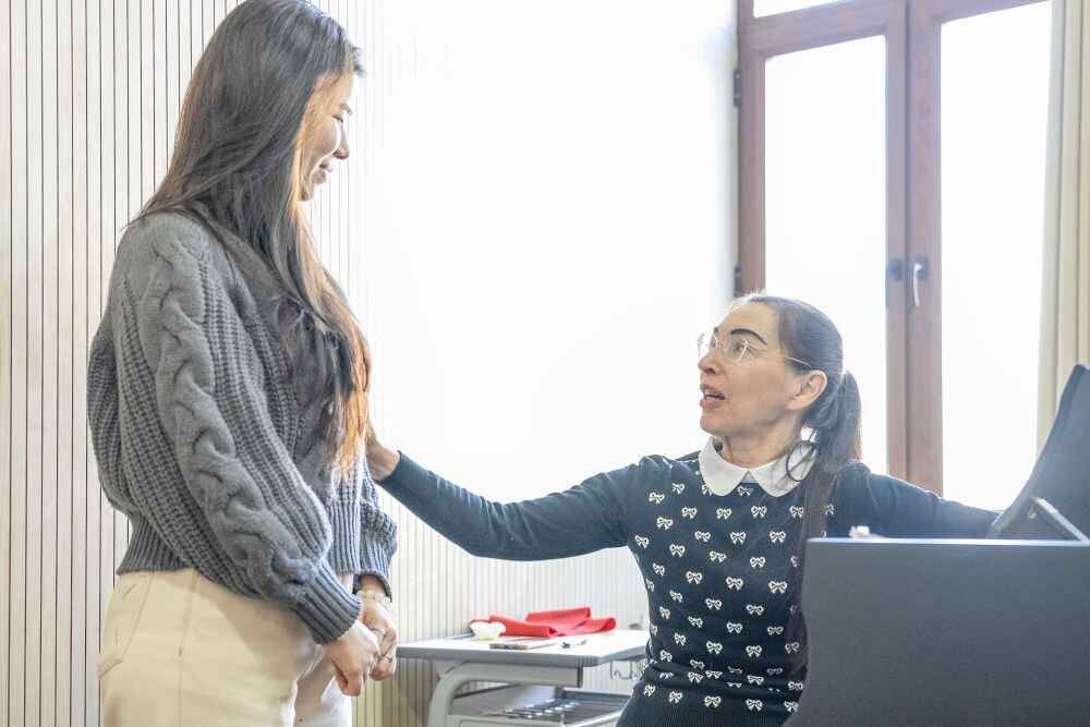俄罗斯钢琴家奥莉加在哈尔滨音乐学院教室和中国学生交流(2021年12月21日摄)。常年在德国、俄罗斯等国家演出的奥莉加给学校的师生带来了许多关于世界音乐的最新见闻,为学生们打开眼界。