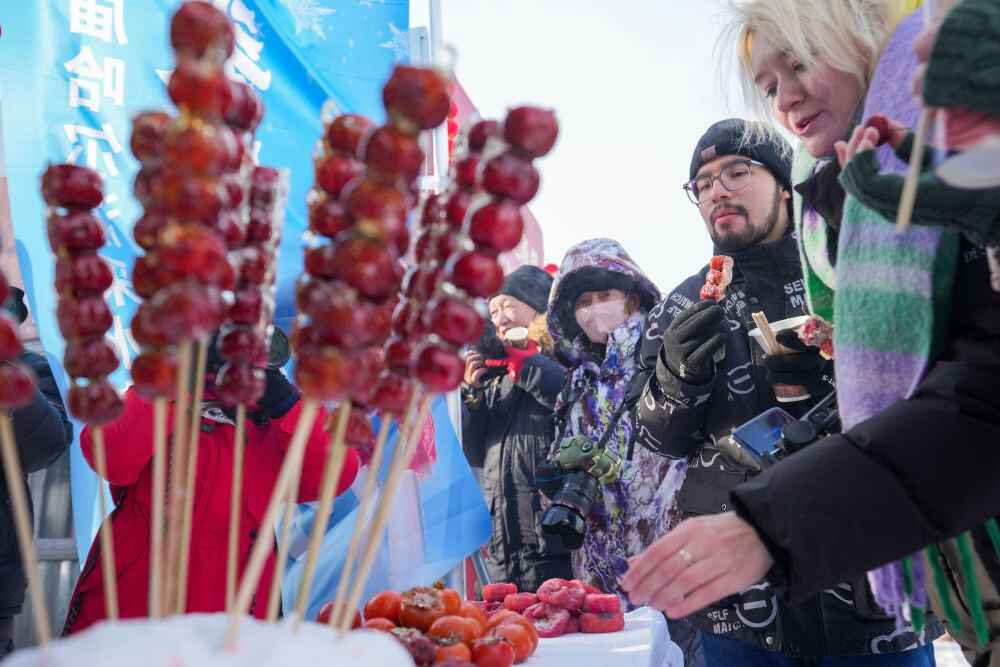 2024年12月7日,外国游客在第五届哈尔滨采冰节现场品尝冻货。