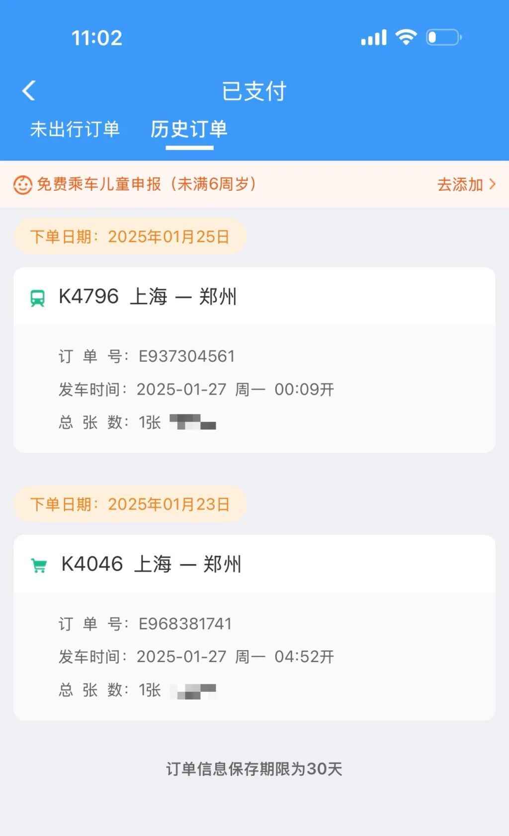 澎湃新闻候补成功买到一张1月27日4时52分上海开往郑州的K4046次列车硬座车票,且有座位。