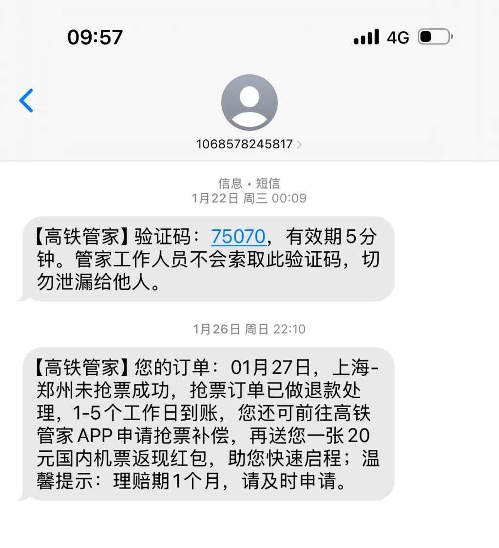 1月26日21时11分,抢票耗时约81小时后,航旅纵横短信告知抢票失败。随后,该平台将164.5元全额退款。