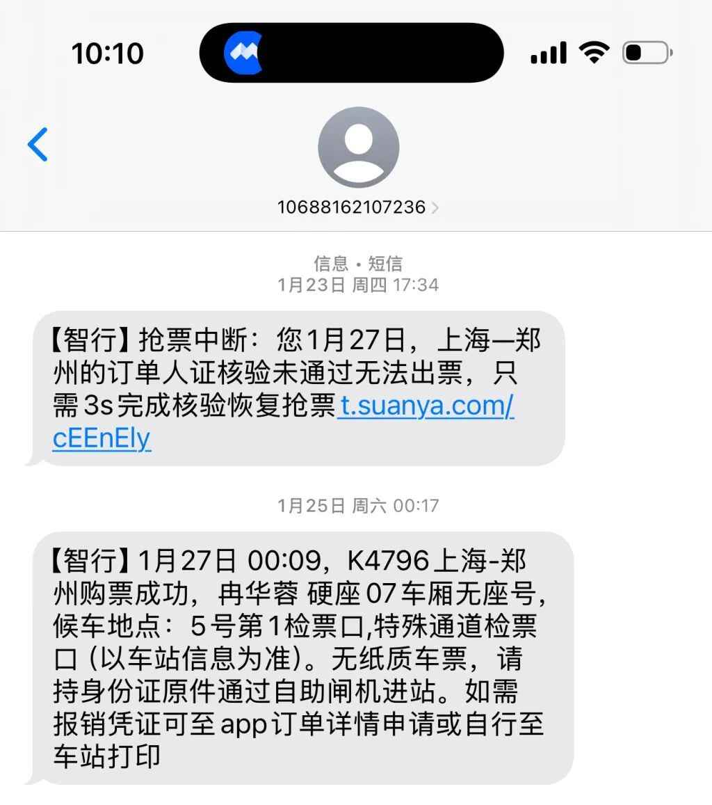 36个小时后,直到1月25日0时17分,智行App短信通知购票成功,买到1张1月27日K4796的无座车票。