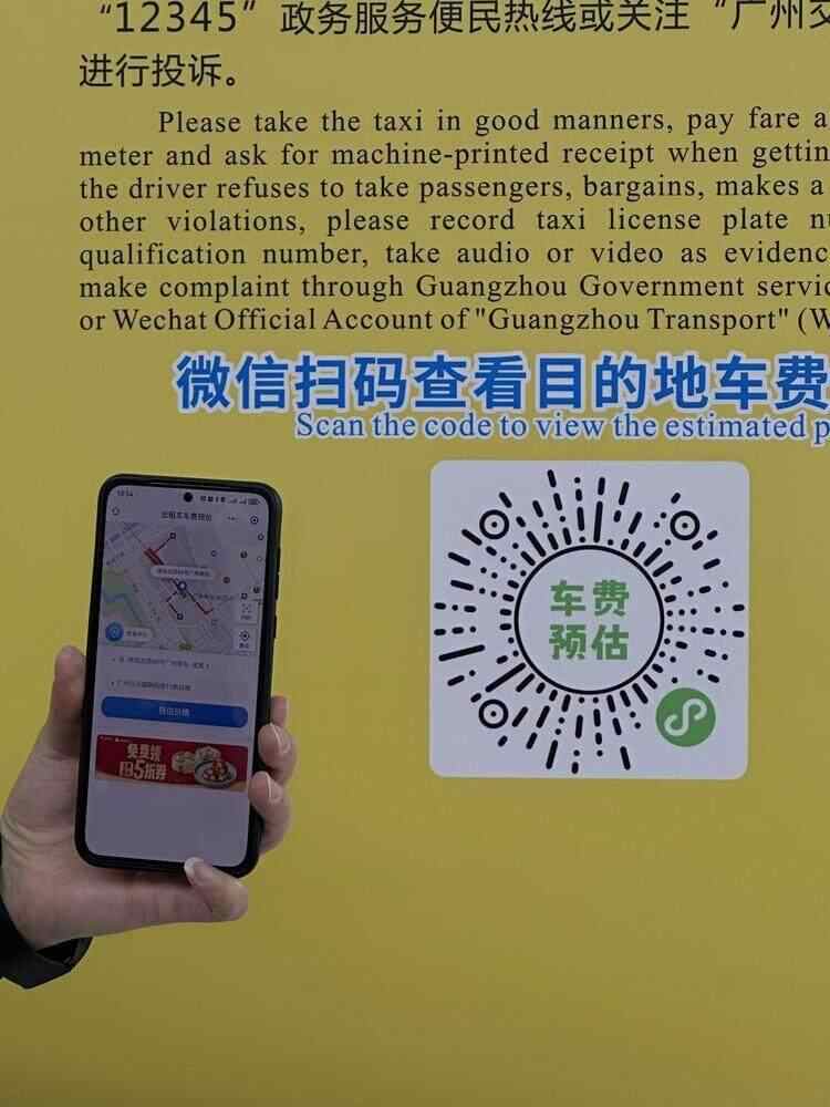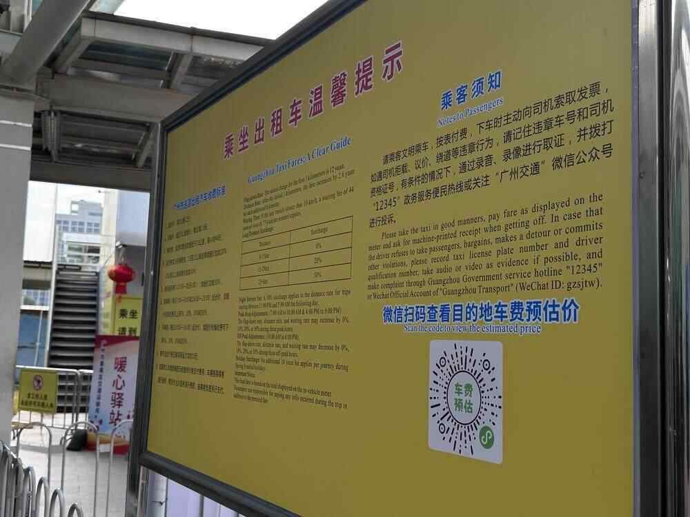 在白云机场、广州南站等枢纽站场出租车上客点,一块黄色的提示牌格外醒目。记者了解到,广州市交通运输部门会同市公交集团开发上线了“车费预估”小程序,乘客可现场扫码掌握相关信息,做到心中有数。