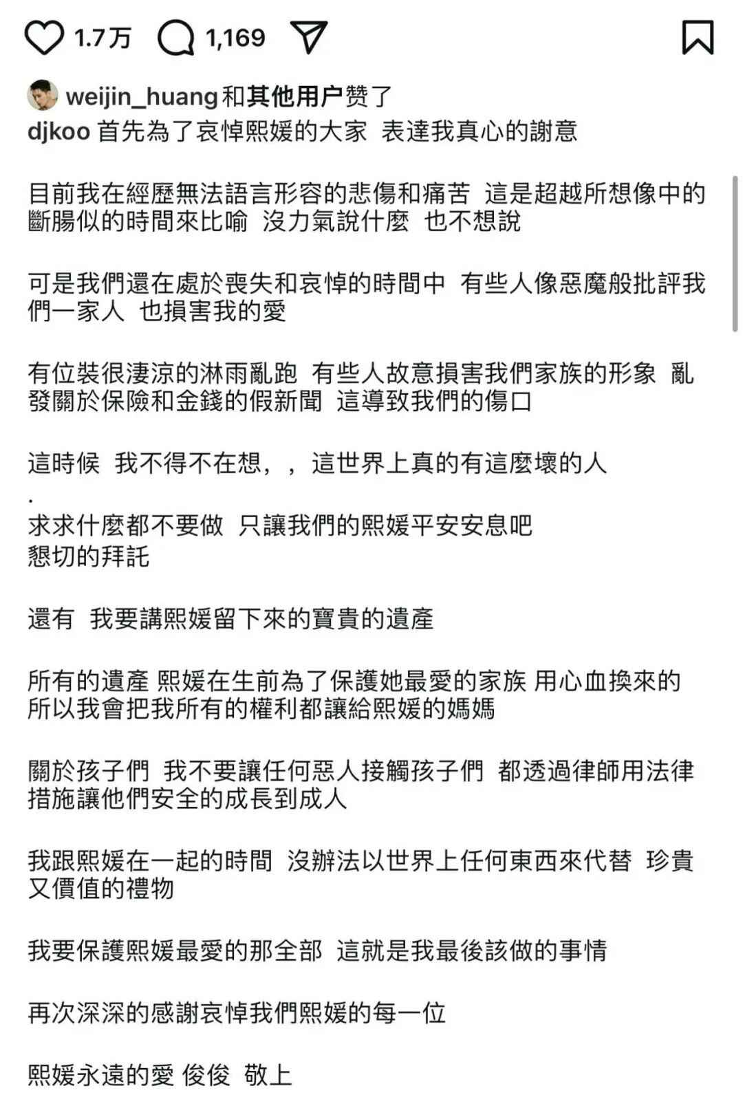 至于外界高度关注的遗产部分,具俊晔身为大S法定配偶,他称将把所有权利留给大S的妈妈,“熙媛在生前为了保护她最爱的家族,用心血换来的,所以我会把我所有的权利都让给熙媛的妈妈。”文末,他以大S唤他的绰号“俊俊”自称,并表示自己是“熙媛永远的爱”。