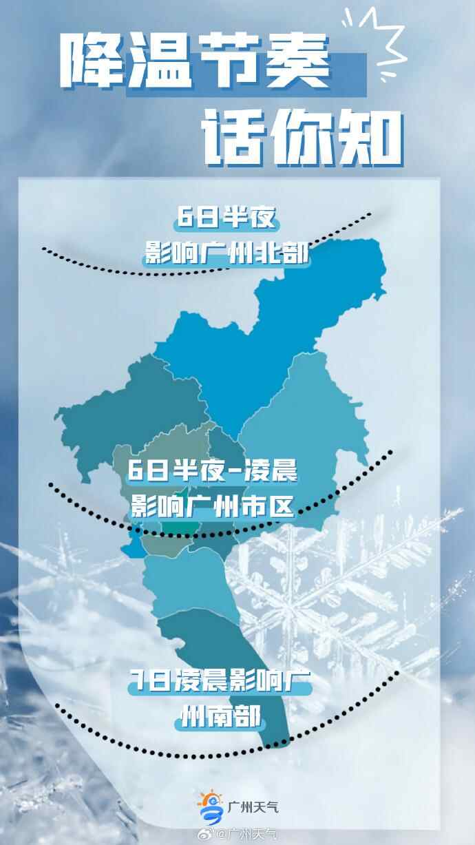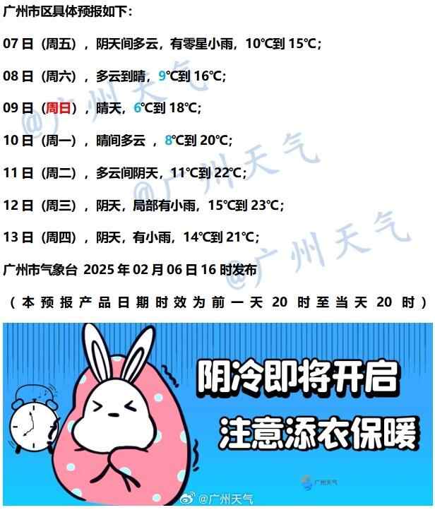 @广州天气预计,受冷空气影响,7日阴天间多云,伴有零星小雨,日平均气温下降3-5℃,9日早晨出现过程最低气温6℃左右,体感湿冷。