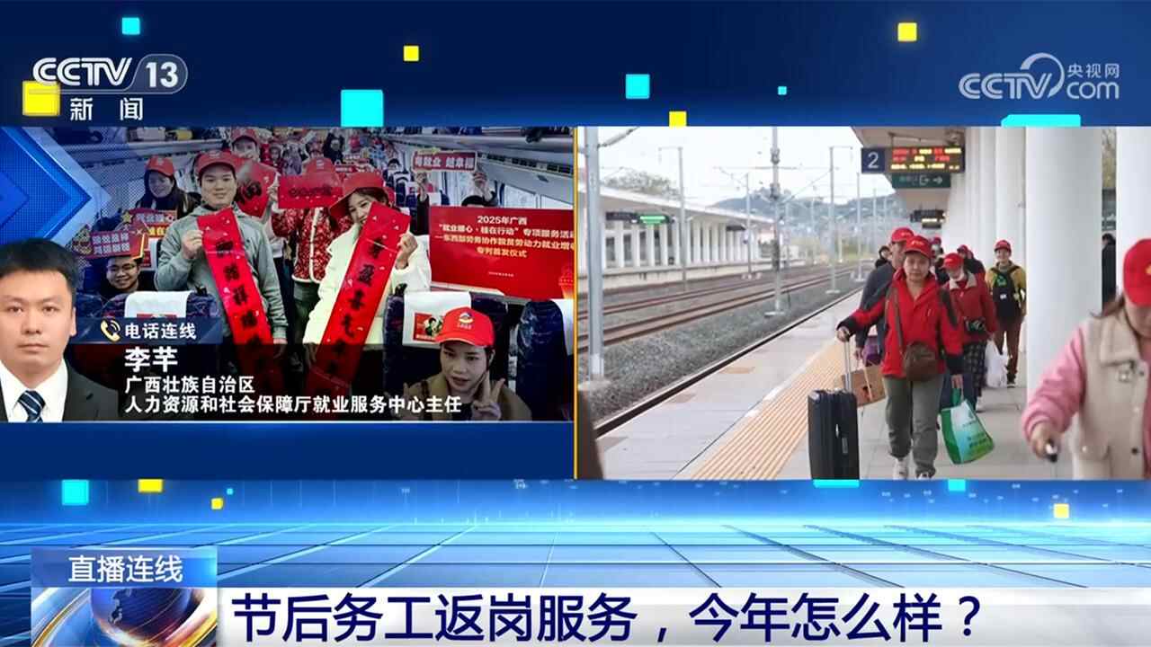 央视网消息: 随着春节假期结束,务工人员又踏上返岗之路,开启了新一年的打拼。从家乡到异乡,如何让大家的返岗之路顺畅舒心?一系列针对性的帮扶措施里,又能看到怎样的变化与温度?《新闻1+1》连线广西壮族自治区人力资源和社会保障厅就业服务中心主任李芊,广东省人社厅就业服务管理局副局长程涛,一起关注。