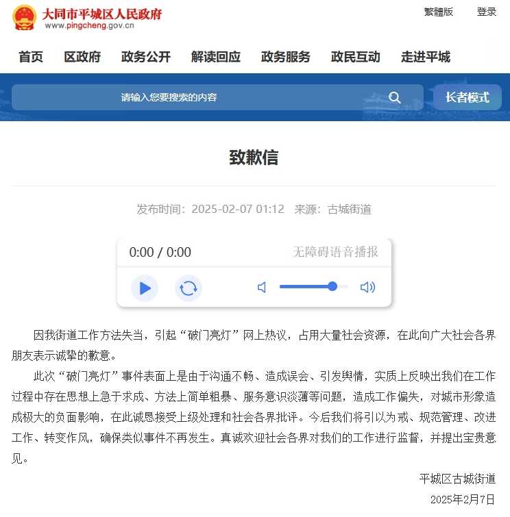2月7日,山西大同平城区古城街道发布致歉信:因我街道工作方法失当,引起“破门亮灯”网上热议,占用大量社会资源,在此向广大社会各界朋友表示诚挚的歉意。