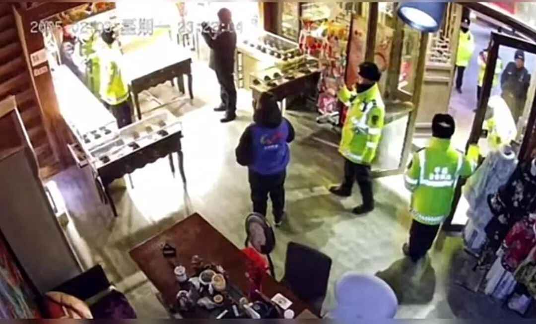 随后,店铺门被打开,数名工作人员进入店铺内,将店内灯光打开后离开,几名工作人员使用U型锁从门外将店门上锁。