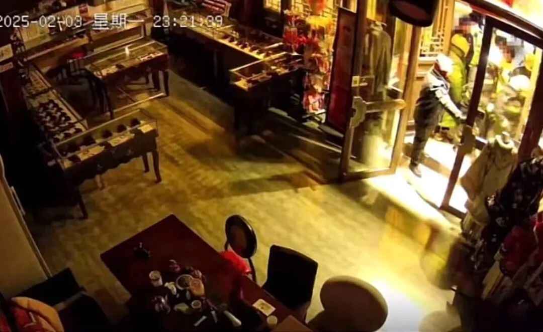此前网传监控视频显示,一店铺门外站有多名身穿制服的工作人员,其中有几名穿消防员制服人员蹲在门口使用工具撬门。
