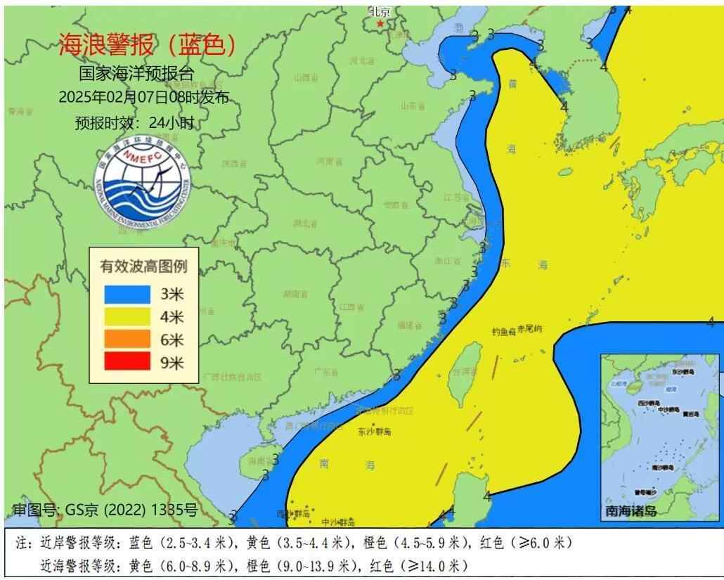 受冷空气的影响,预计2月7日中午到8日中午,渤海、黄海将出现3到5米的大浪到巨浪区,东海、台湾海峡、南海将出现3.5到5.8米的大浪到巨浪区;辽宁南部、山东北部、东部、江苏、上海、浙江、福建、广东东部、海南东部近岸海域将出现2到3.4米的中浪到大浪,近岸海域海浪预警级别为蓝色。