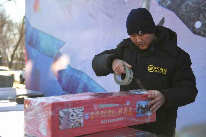 在“鱼墙”旁边,密集地分布着各个电商和物流公司。选好的鱼可以送到这里,装箱发往全国各地。查干湖冬捕如今也搭上了网络直播销售的潮流,办起了线上冬捕节等活动,以时尚化、趣味化的方式吸引更多年轻消费者。