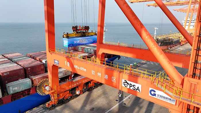 2024年的最后一天,在广西北部湾港钦州港区大榄坪南作业区5#泊位,随着起吊指令的发出,装载物资的集装箱被平稳吊起装载到“新扬州”轮上,自此,北部湾港2024年集装箱吞吐量突破900万标箱。