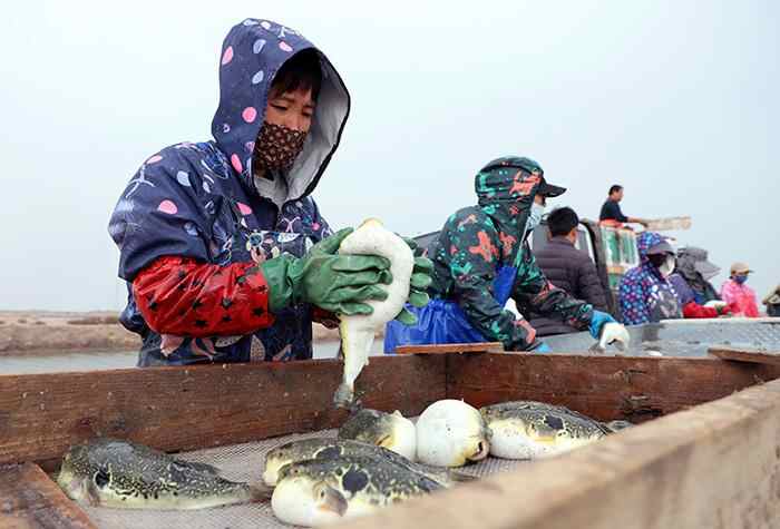 在河北唐山市滦南县河鲀养殖基地,工人们正在忙碌。滦南县委宣传部供图