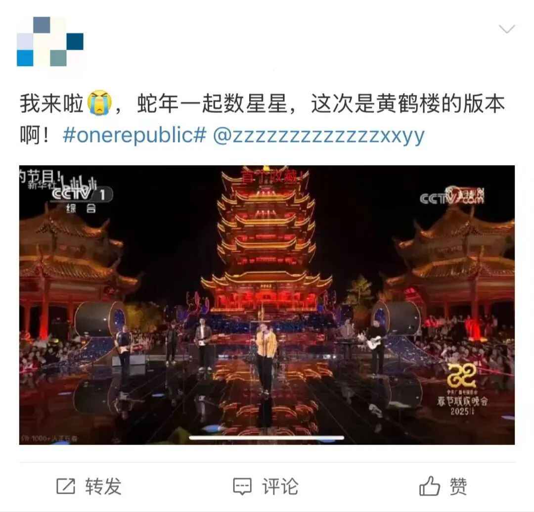 在春晚武汉分会场包蕴东方诗意的黄鹤楼前,《Counting Stars》宛若一场跨越千年的呼唤。当主唱高歌的剪影与黄鹤楼重叠,观众恍若看见“手可摘星辰”的盛唐轮廓,通过春晚舞台在数字时代重生。