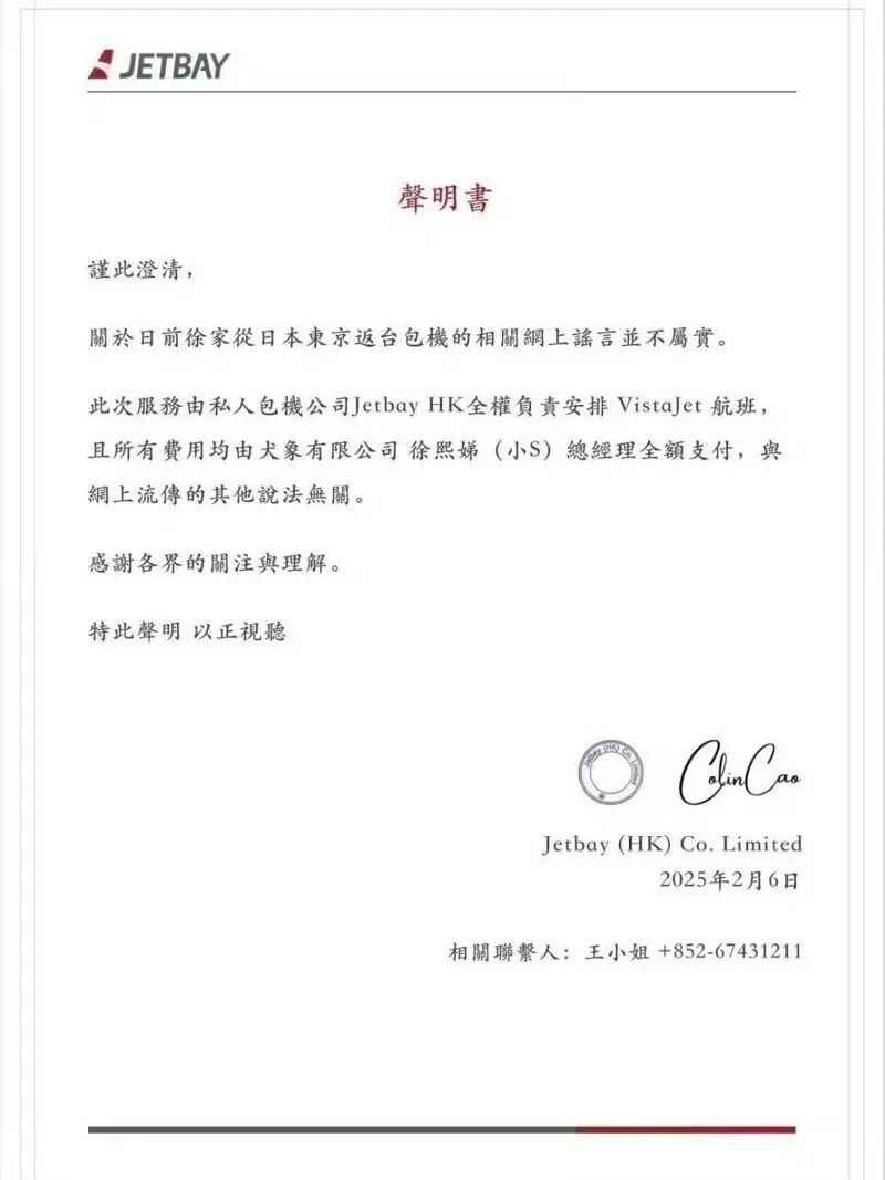 此外,2月6日晚,包机公司也发出声明“以正视听”,提到“关于日前徐家从日本东京返台包机的相关网上谣言并不属实”,声明中再次重申,“此次服务”所有费用“均由犬象有限公司 徐熙娣(小S)总经理全额支付,与网上流传的其他说法无关。”