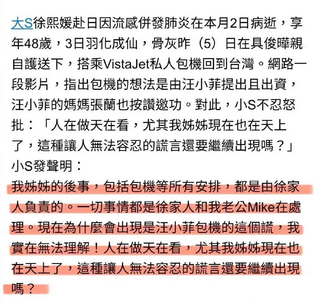 2月6日上午,小S通过媒体发布声明怒斥谣言,表示姐姐的后事,包括包机等所有安排,“都是由徐家人负责的,一切事情都是徐家人和我老公Mike在处理,现在为什么会出现‘汪小菲包机’的这个谎,我实在无法理解!”