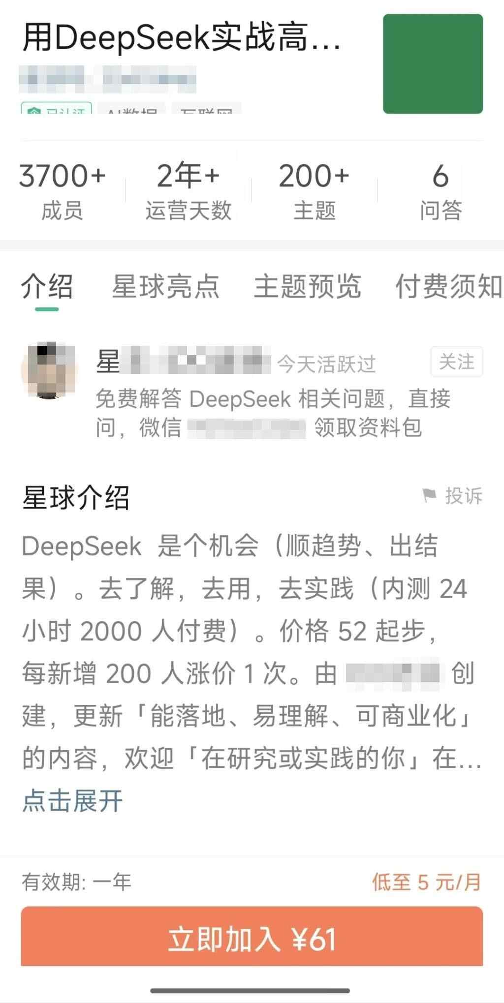 记者查询发现,某热门DeepSeek社区会员费为61元,总会员数超过3600人,在DeepSeek爆红的近一个月里,仅会员费收入就超过18万元。