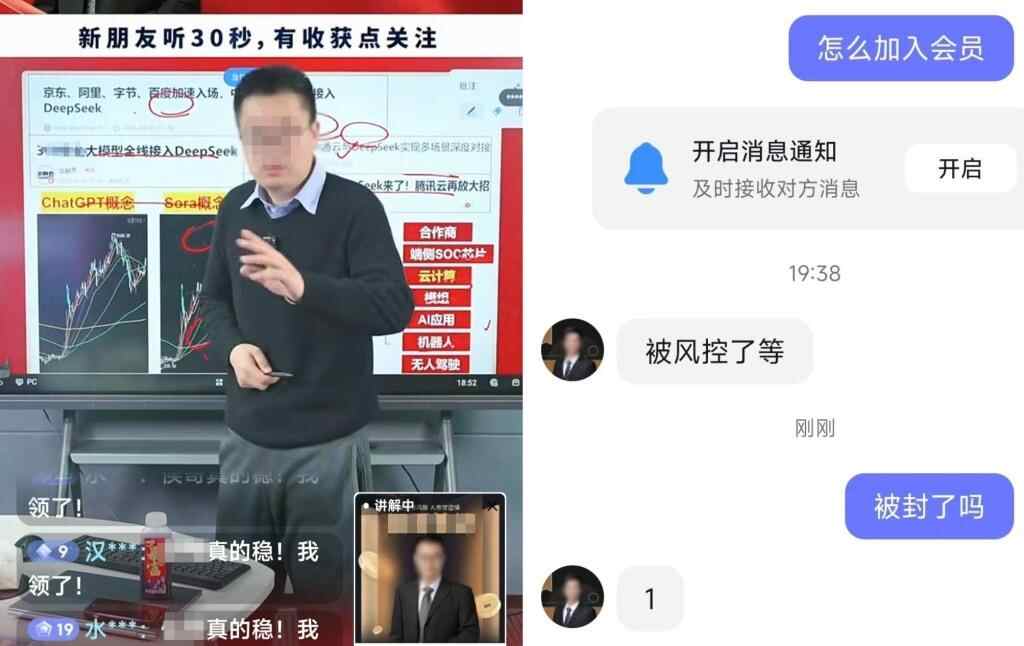 不少荐股博主还开发出DeepSeek的炒股功能,在抖音直播间里,记者看到,有博主宣传只要用同花顺等炒股软件接入DeepSeek,就能控制电脑全自动分析股票,在直播间下方还附上了教程和软件的购买链接。记者联系到了其中一位用DeepSeek分析股票的荐股博主,对方称自己已经被封号。