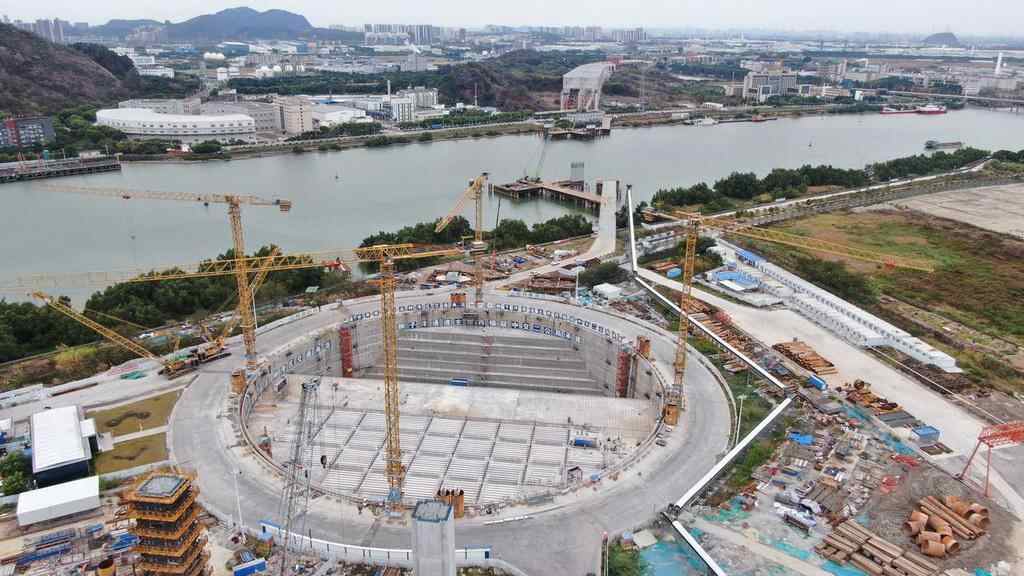 这是狮子洋通道主桥西锚碇施工现场(2月7日摄,无人机照片)。