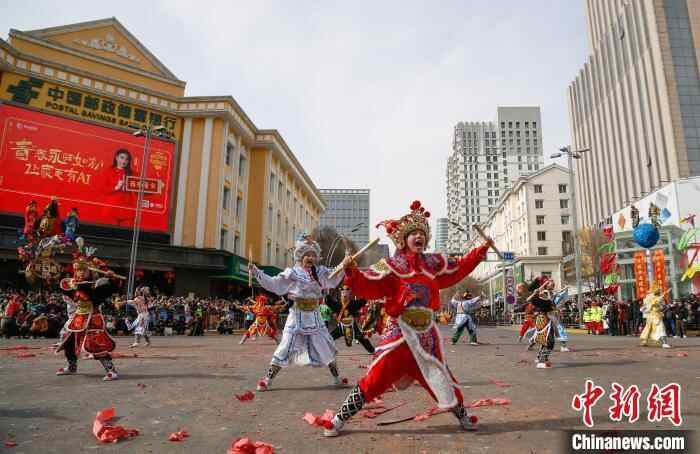 2月7日,来自广东省揭阳市的英歌舞首次亮相青海西宁,参与优秀社火集中巡游活动。30名身着英歌舞服饰的青少年,跟随节奏起舞,放声高喊,与历史悠久的青海社火进行了一场“对话”。图为潮汕英歌舞表演现场。中新社记者 马铭言 摄