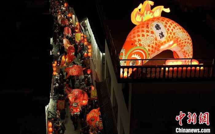 2月7日,安徽省黄山市歙县瞻淇村举行数场鱼灯巡游活动,众多游客来到这里,感受这座徽州古村的独特风景。瞻淇鱼灯起源于南宋,形似鲤鱼,寓意年年有余,吉祥如意。嬉鱼灯是当地一种重要的传统文化和民俗活动,每年农历正月期间,瞻淇鱼灯在古村小巷穿梭游动,栩栩如生。图为瞻淇鱼灯表演队伍在村中嬉游。(无人机照片)中新社记者 韩苏原 摄