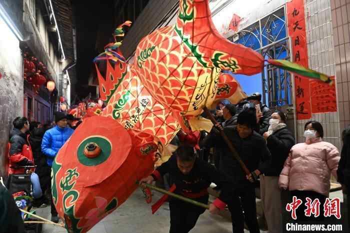 图为瞻淇鱼灯表演队伍在村中嬉游。中新社记者 韩苏原 摄