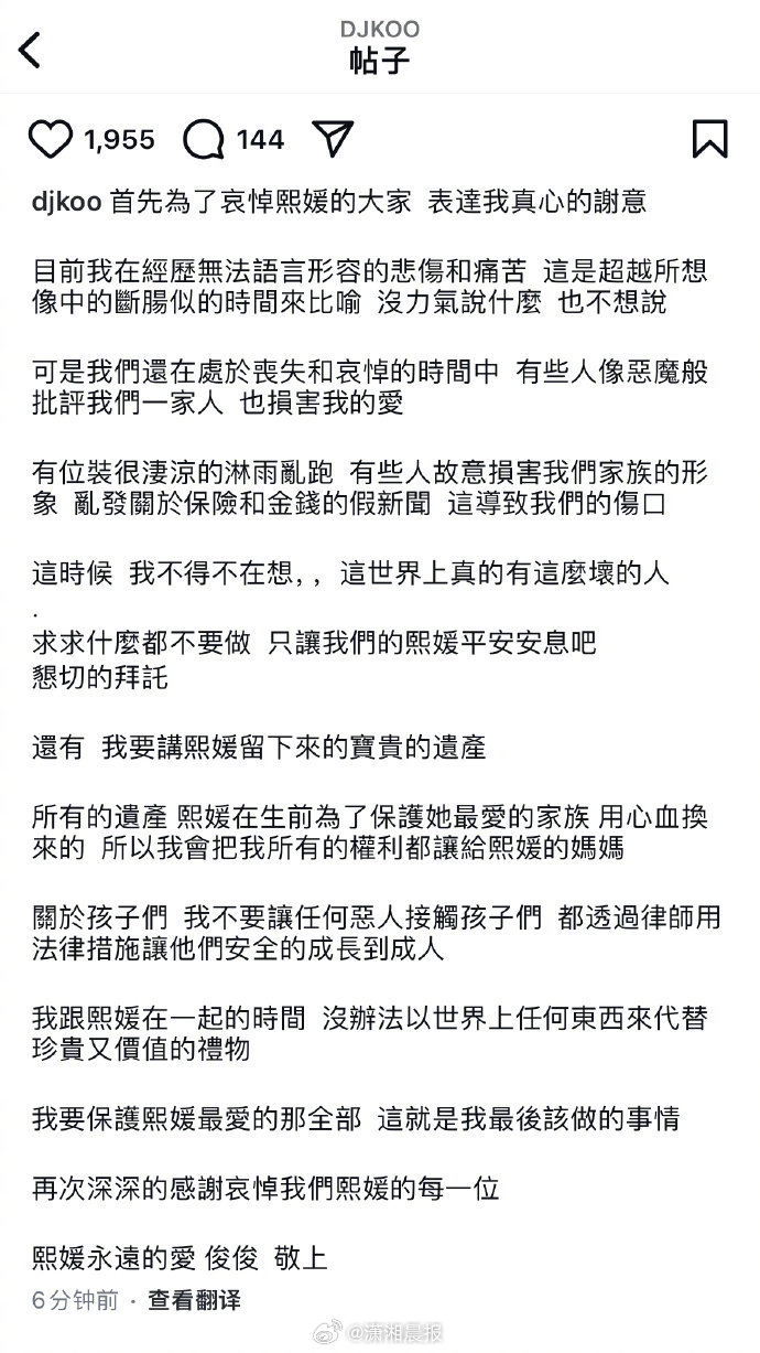 对外界高度关注的遗产部分,具俊晔身为大S法定配偶,他称将把所有权利留给大S的妈妈,“熙媛在生前为了保护她最爱的家族,用心血换来的,所以我会把我所有的权利都让给熙媛的妈妈。”文末,他以大S唤他的绰号“俊俊”自称,并表示自己是“熙媛永远的爱”。