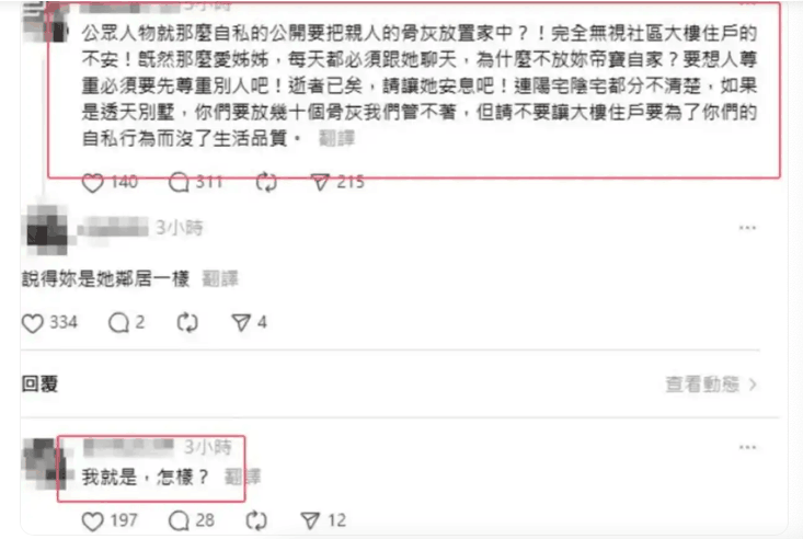 但此举疑似引发邻居不满,2月7日,媒体截图显示,大S所在台北市信义区豪宅有邻居在社交平台炮轰S家人,“公众人物就那么自私地公开要把亲人的骨灰放置家中?完全无视社区大楼住户的不安!既然那么爱姐姐,每天都必须跟她聊天,为什么不放你帝宝(小S家社区)自家?”