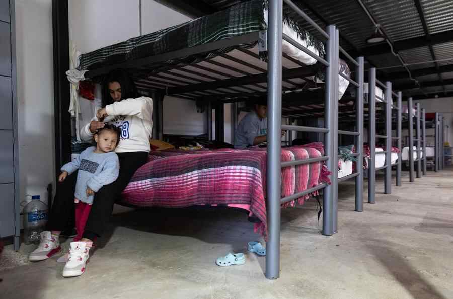 2025年2月2日,在墨西哥奇瓦瓦州华雷斯城的一处移民收容所,一位母亲为女儿梳头。新华社记者李梦馨摄