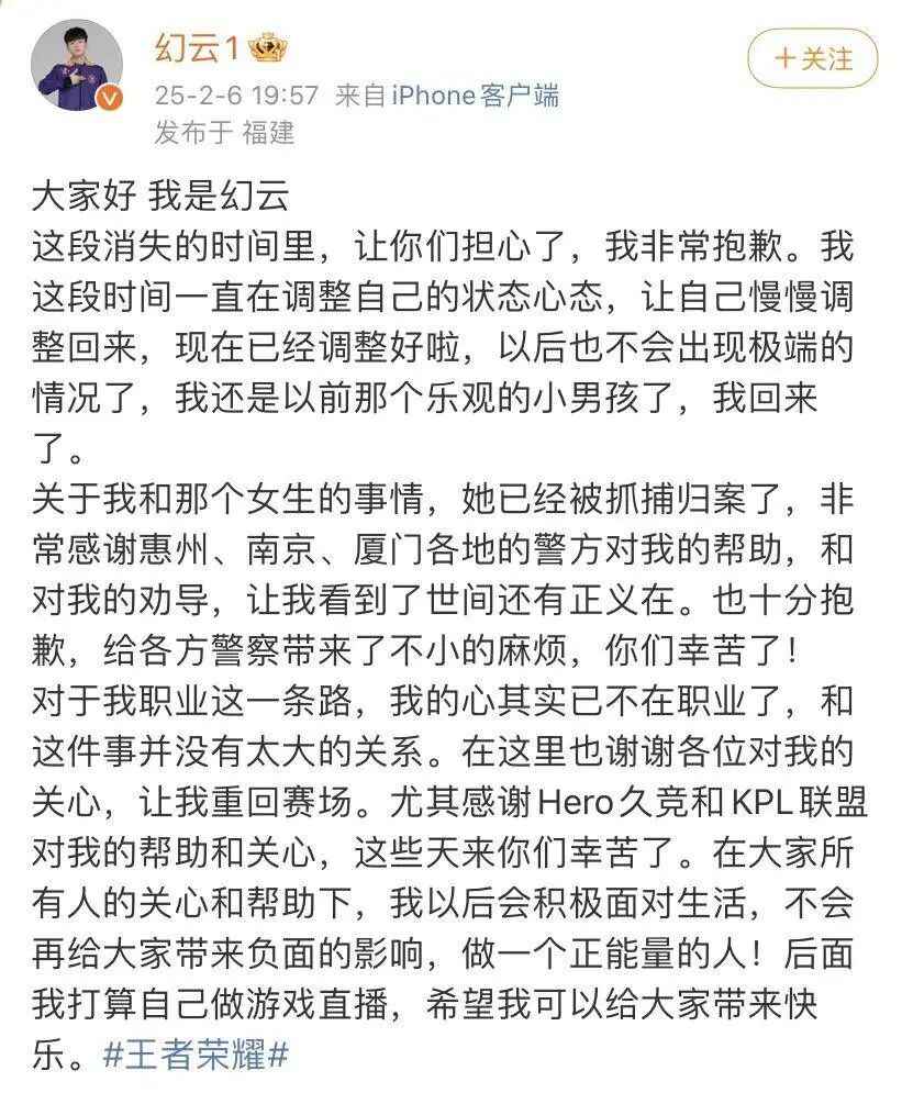 2月6日,19岁职业电竞选手赖润豪(游戏ID:幻云)在社交平台发文:这段消失的时间里,让你们担心了,我非常抱歉。这段时间,我一直在调整自己的状态,现在已经调整好啦,以后不会出现极端情况了。