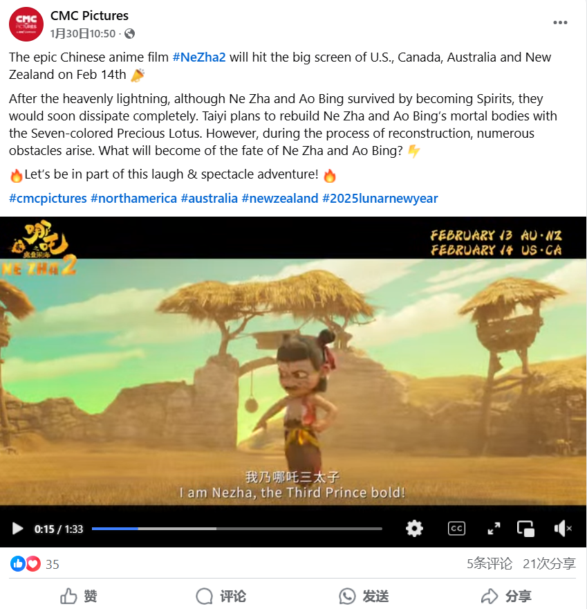 1月30日,据华语电影海外发行平台华人影业在脸书平台发布的消息,电影《哪吒之魔童闹海》(《哪吒2》)将于2月14日在美国、加拿大等地正式上映。